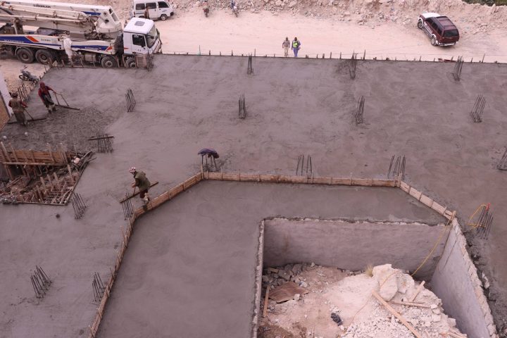 تنفيذ أعمال الرقاب، ومباني الكرسي والجدران الساندة، وإنشاء خزانين ارضيين بسعة (120متر مكعب و78 متر مكعب ) على التوالي، إلى جانب أعمال الدفان، والميدات الأرضية، وصب الخرسانة العادية لأرضية المبنى، وأعمال الأعمدة الخرسانية المسلحة للدور الأرضي، وصولًا إلى صبة سقف الدور الأرضي لتكتمل بذلك أعمال الهيكل الخرساني لهذا الدور.