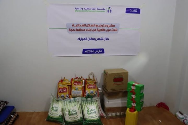 انطلاقًا من مسؤوليتها المجتمعية، واستشعارًا لواجبها الإنساني تجاه طلاب العزب الطلابية، ولا سيما القادمين إلى محافظة تعز من محافظات بعيدة عنها ، نفذت مؤسسة أفق للتعليم والتنمية مبادرة دعم تمثلت في توزيع ثلاث سلل غذائية( وبحسب استطاعة المؤسسة) لثلاث عزب طلابية من أبناء محافظة حجة، ولعدد 24 طالباً، الذين حالت الظروف الراهنة دون عودتهم إلى أسرهم خلال شهر رمضان المبارك.